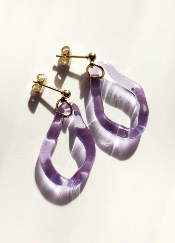 Ta para kolczyków urzeka tajemniczym odcieniem fioletu, stworzonym ze szkła neodymowego. To szczególny rodzaj szkła, który sprawia, że barwa zmienia w zależności od światła. W zimnym świetle kolor wydaje się chłodnym błękitem, natomiast w ciepłym oświetleniu nabiera różowo-lawendowych tonów.