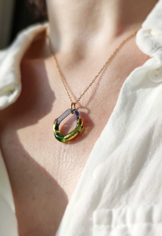 W tym modelu połączone zostało wytrzymałe szkło borokrzemowe w intrygujących odcieniach kobaltu i intensywnej, trawiastej zieleni. Świetlistość szkła podkreśla szlachetne wykończenie: wisiorek jest dodatkowo pokrywany płatkowym złotem 23 i 3/4 karata.