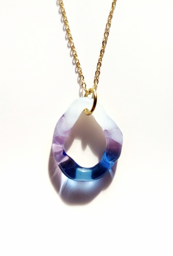 Wisiorek z kolekcji Amorphic to spotkanie prostoty i wyrafinowanej elegancji. Nieregularna forma szkła kryje w sobie subtelną grę barw, od mlecznej bieli, przez lawendowy fiolet szkła neodymowego*, aż po głęboki, kobaltowy błękit.