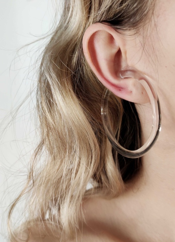 Szklana nausznica w minimalistycznym klimaciei maxi rozmiarze. Prosta, lecz wyróżniająca się forma przypadnie do gustu miłośniczkom i miłośnikom mimimalistycznych, a zarazem niebanalnych form biżuteryjnych.